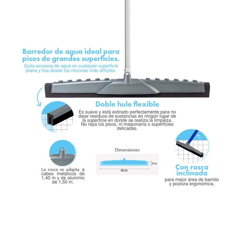 Barredor de agua ideal para pisos de grandes superficies. Permite quitar excesos de agua en cualquier superficie plana y lisa desde los rincones mas difíciles. Su borde de goma permite un fácil desplazamiento en la superficie húmeda.