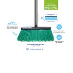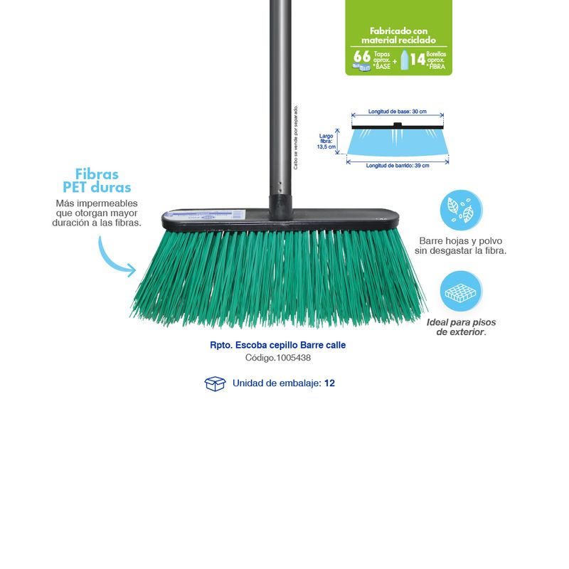 Escoba dura ideal para barrer espacios externos. Sus cerdas están fabricadas de PET duras, el material empleado el cual se utiliza para su fabricación es de material plástico recuperado. Longitud de barrido: 39cm. Largo de la fibra: 13,5cm. Longitud de la base: 30cm.