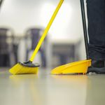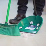 Recogedor con banda de goma coinyectada que se adhiere a todo tipo de suelo evitando que el polvo pase por debajo. Cuenta con un mecanismo diseñado para limpiar la escoba y eliminar pelusas adheridas.