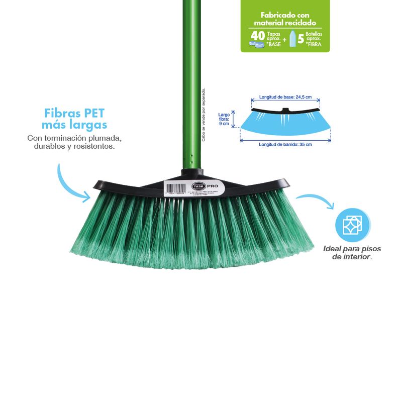 Escoba suave con fibras de PET con terminación plumada más durables y resistentes. Por su tamaño se adapta fácilmente a espacios de difícil acceso. Ideal para barrer pisos de cerámica, mármol, entre otros. Longitud de barrido: 35cm. Largo de la fibra: 9cm. Longitud de la base: 24,5cm.